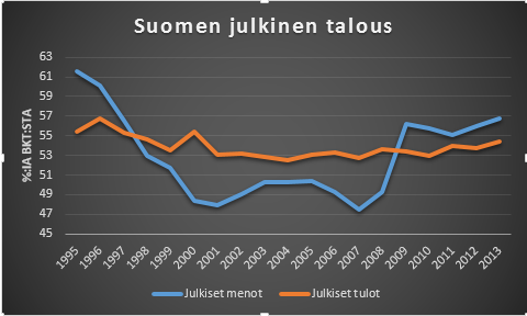 Tässä on se keskeinen valinta, joka unohtuu kun fokusoidaan velkasuhteen ripeään taittamiseen. Haluammeko Suomen, jossa verotus on kireämpää ja julkisen sektorin osuus taloudesta pysyvästi jää korkeammalle tasolle kuin ennen viime vuosien taantumia? Siihen suuntaan olemme nyt menossa.
