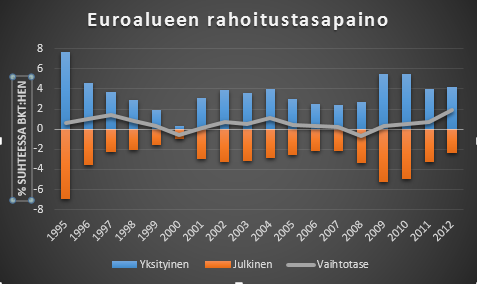 Alla oleva kuva havainnollistaa tämän yhteyden euroalueella. Julkisen ja yksityisen sektorin rahoitustilanne ovat pitkälti toistensa peilikuvia. Viime vuonna toki sekä yksityinen sektori, että julkinen sektori onnistui samanaikaisesti kasvattamaan säästämistään. Muu maailma auttoi kääntymällä yhä vahvemmin euro-alueen tuotannon netto-ostajaksi, mikä näkyy kasvavana vaihtotaseen ylijäämänä. Toki kasvanut säästämisinto heijastui myös syvenevänä taantumana