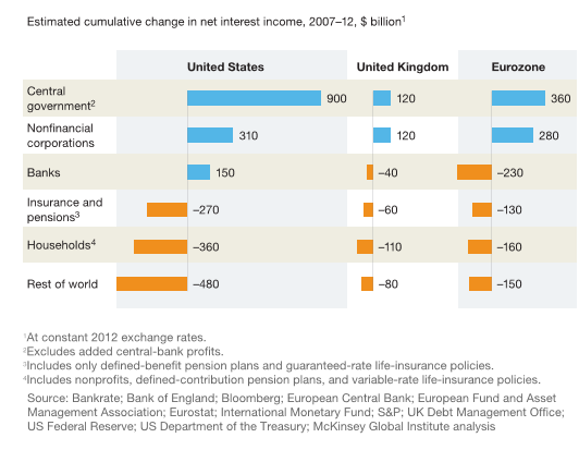 McKinsey on julkaissut raportin, QE and ultra-low interest rates: Distributional effects and risks, joka pohtii keskuspankkien toimien vaikutusta. Raportti sisältää kuvion, joka kiteyttää miten eri talouden sektoreiden korkokate on muuttunut vuodesta 2007. Kuvio kiteyttää sen, että alhaisista koroista ovat odotetusti hyötyneet suuret velalliset (julkinen sektori ja yritykset). Laskun ovat maksaneet kotitaloudet ja Euromaissa ennen kaikkea pankit.