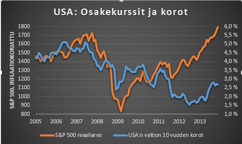 On sinänsä ihan mahdollista, että keskuspankit voisivat nostaa osakekursseja vaikka ne eivät onnistu piristämään taloutta. Painamalla korkoja alaspäin keskuspankit ajavat sijoittajia hakemaan tuottoa osakkeista ja nostavat siten osakekursseja. Tällaista kehitystä nähtiin esimerkiksi kun keskuspankit syksyllä 2011 avasivat rahahanansa eurokriisin kärjistyessä. Korot laskivat seuraavan vuoden aikana samalla kun osakekurssit nousivat.