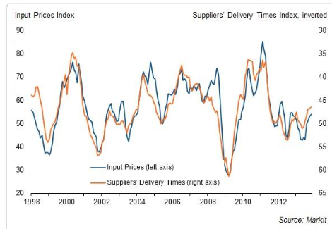 Euroalueen ostopälliköiden indeksien hintakomponentit nousivat korkeimmilleen yli vuoteen. Ei mikään yllätys, kun tietää, että inflaatio seuraa talouden käänteitä viiveellä.