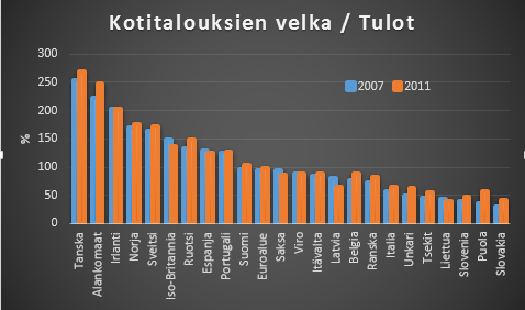 Missä kahdessa EU-maassa kotitalouksien velka oli korkein suhteessa tuloihin ennen finanssikriisiä? Mieleen tulee ehkä asuntokuplan läpikäyneet kriisissä olevat Irlanti ja Espanja?