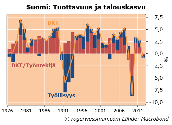 Ei ole mikään sattuma, että tuottavuus on tippunut niinä vuosina kuin talous on taantunut. Se ei tarkoita että tuottavuuden lasku olisi taantuman syy. Tuotanto ei ole laskenut siitä syystä, että tuottavuuden heikkenemisestä johtuen ei olisi pystytty tuottamaan enemmän. Päinvastoin tuotanto per työntekijä on laskenut koska vientiteollisuuden kysyntä on ollut heikko.