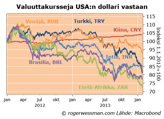 Viime päivien lasku kehittyvien markkinoiden valuutoissa näyttää osittain toistolta viime kesän tapahtumiin. Silloin spekulaatiot siitä, että Yhdysvaltain keskuspankki alkaa kiristää rahahanoja, asettivat kehittyvien markkinoiden valuutat paineeseen. Nyt Fedin kiristyminen on alkanut. Kun korot nousevat kehittyneissä maissa, kehittyvien markkinoiden tarjoama korkeampi tuotto sijoittajille on vähemmän houkutteleva, ja siten tyypillisesti näiden maiden valuutat heikkenevät.