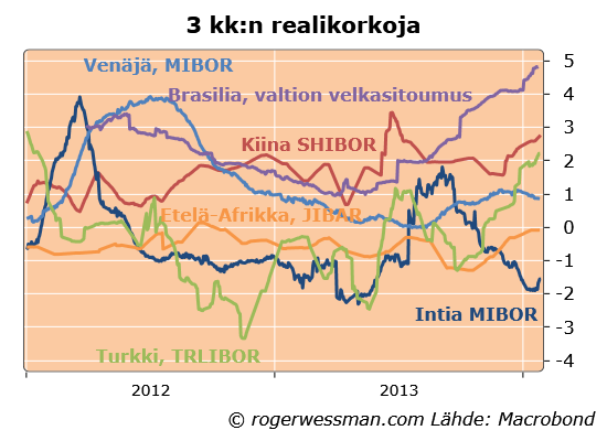 Toki tilanne vaihtelee maiden välillä. Esimerkiksi Turkilla ja Etelä-Afrikalla on viime vuosina ollut suuria alijäämiä. Näidenkään maiden kohdalla 90-luvun lopun kaltainen romahdus on poissuljettu yhdestä yksinkertaisesta syystä: Niillä on kelluvia valuuttoja. Maat eivät epätoivoisesti yritä puolustaa valuuttakurssejaan korkeilla koroilla, vaan heikkenevän valuutan annetaan vahvistaa vientisektorin näkymiä. Toki keskuspankeilla on syytä nostaa korkoja, jotta ei heikkenevä valuutta kiihdyttäisi inflaatiota – mutta reaalikorot pysyvät matalina.