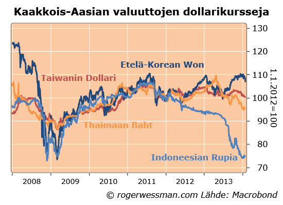 Oma lukunsa on tietysti Kiina, jonka valuuttakurssi on tiukasti sidottu dollariin. Kiinan juan on kuitenkin pikemmin pidetty keinotekoisesti aliarvostettuna eikä mitään devalvaatiopaineita siten ole. Muiden kehittyvien markkinoiden valuuttojen heikkeneminen ei tätä tilannetta merkittävästi muuta. Kiinalle useimmat nämä maat eivät ole kilpailijoita vaan pikemmin Kiinalle raaka-aineita toimittavia kauppakumppaneita. Kiinan kohdalla ei ole tästä kehityksestä syytä huoleen, niin kauan kuin Kaakkois-Aasian maiden valuutoissa ei nähdä dramaattista heikkenemistä.