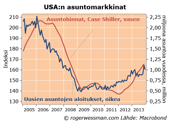 Eniten keskuspankin toimet heilauttavat yleensä asuntomarkkinoita. Fed nimenomaan on tähän sektoriin tähdännyt ostamalla asuntovakuudellisia lainoja. Asuntomarkkinoilla onkin tapahtunut merkittävä käänne. Asuntojen hinnat ovat kahdessa vuodessa nousseet 20 prosenttia ja asuntorakennusprojektien aloitukset ovat pohjalukemistaan lähes tuplaantuneet.