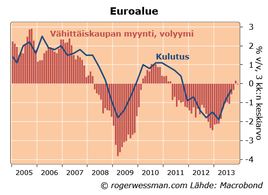 Jos lukuja hivenen tasoittaa ne vahvistavat, että lasku euroalueen kulutuksessa on pysähtynyt. Tänä vuonna voidaan odottaa jopa pientä kasvua.