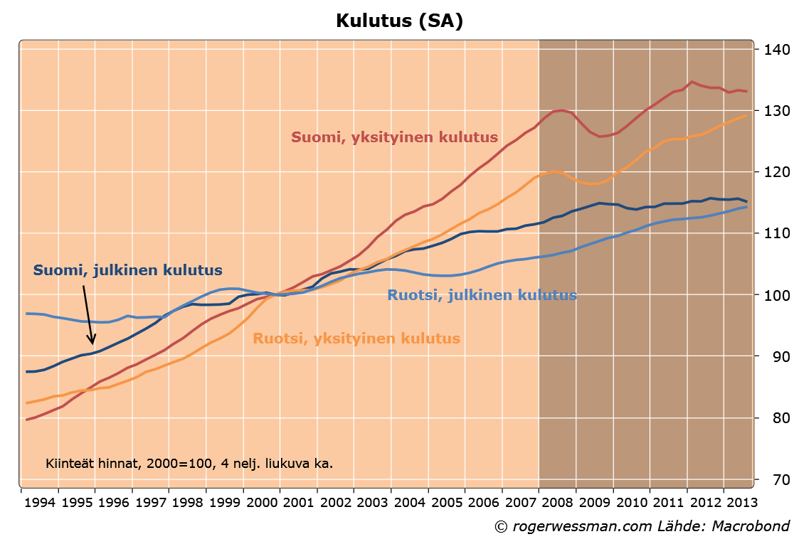 Kulutuksen kehitys on ollut tasaisempaa, vaikka viimeinen reilu vuosi onkin ollut rohkaisevampi Ruotsissa kuin Suomessa. Kulutuksen samankaltainen trendi selittynee esimerkiksi työttömyysasteen sekä luottamuslukujen samansuuntaisella kehityksellä.