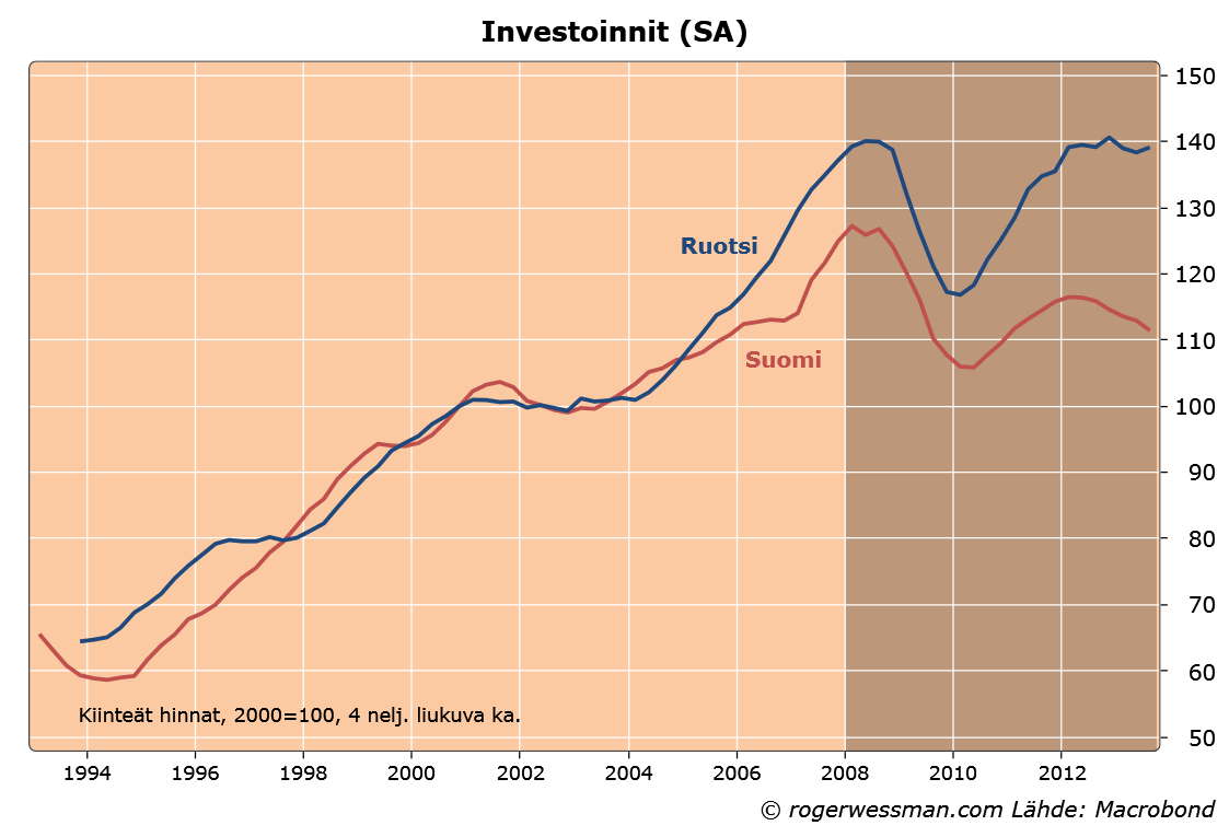 Investoinnit sen sijaan ovat yksi merkittävimmistä Suomen ja Ruotsin talouskehitystä eriyttäneistä tekijöistä. Suomessa investointien kehitys verrattuna vuoden 2008 alkuun on ollut heikkoa, kun taas Ruotsissa taantuman aikaisesta kuopasta on palauduttu hienosti takaisin lähtötasolle. Investointeja rajoittaa Suomessa rakennussektorin epävarmuuden lisäksi heikohko kysyntä niin kotimaassa kuin ulkomailla – merkittävää tarvetta uusiin investointeihin ei ole, ennen kuin kysyntänäkymät paranevat.