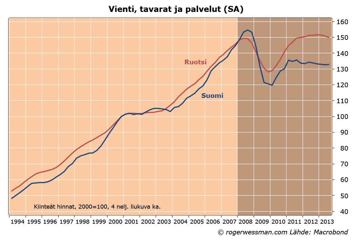 Ruotsi vie voiton viennissä, jonka kehityksessä yhdistyvät niin vientikumppaneiden talouskehitys, valuuttakurssivaikutukset kuin muut ulkoiseen kilpailukykyyn vaikuttavat tekijä. Ruotsissa vienti on kokonaisuudessaan samalla tasolla nyt kuin vuoden 2007 lopulla, kun etenkin palveluvienti on kehittynyt myönteisesti. Suomessa suurimmaksi ongelmaksi on muodostunut tavaraviennin heikkous, jota painanee mm. Nokian hiipuminen ja investointitavaroiden heikko kysyntä.