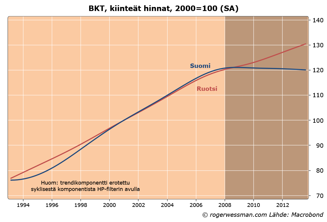 Vertailuja Suomen ja Ruotsin välillä voisi tehdä loputtomiin eri näkökulmista. Inspiraatio tähän kirjoitukseen tuli yliopistolta, jossa makrotalousteorian kurssilla esiteltiin Hodrick-Prescott -filterin käyttöä Suomen ja Ruotsin BKT-datalla (eli poistettiin lyhytaikainen suhdannnevaihtelu trendin ympäriltä). Lopputulos oli verrattain lohduton Suomen kannalta. Siinä missä Ruotsi jatkaa kasvuaan kutakuinkin trendillä, on Suomen talouden trendi tehokkaasti latistunut.