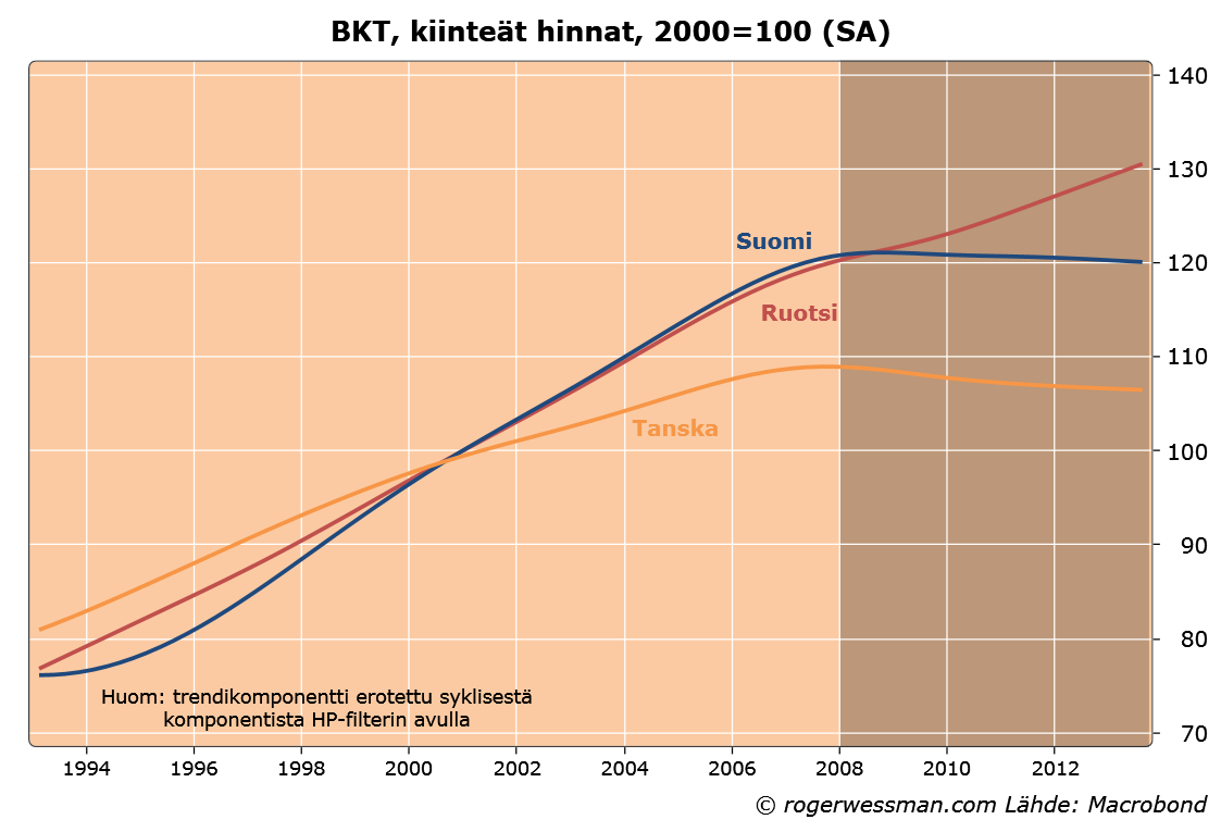Emme kuitenkaan ole keikkuvassa veneessä yksin: Tanskan trendi on Suomen tavoin heikko.