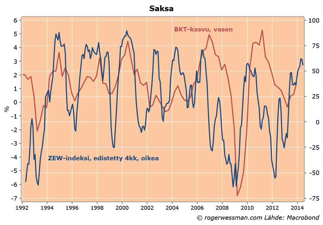 Analyytikoiden mielialaa tunnusteleva ZEW-indeksi ei ole koskaan ollut aivan yhtä tarkka indikaattori Saksan talouden tilasta ja heiluu herkästi markkinamielialan mukana. ZEW-indeksikin yleensä onnistu kuvaamaan talouskasvun käännepisteitä, mutta heilunta indikaattorissa on niin suurta, että kovinkaan luotettavaa kuvaa se ei yksittäisen kuukauden tai kvartaalin kohdalla talouden aktiviteetista anna. Tästä huolimatta ZEW:inkin voi lisätä myönteistä mielialaa tukevien indikaattoreiden listalle, sillä sen odotuksia kuvaava alaindeksi on edelleen korkealla tasolla.