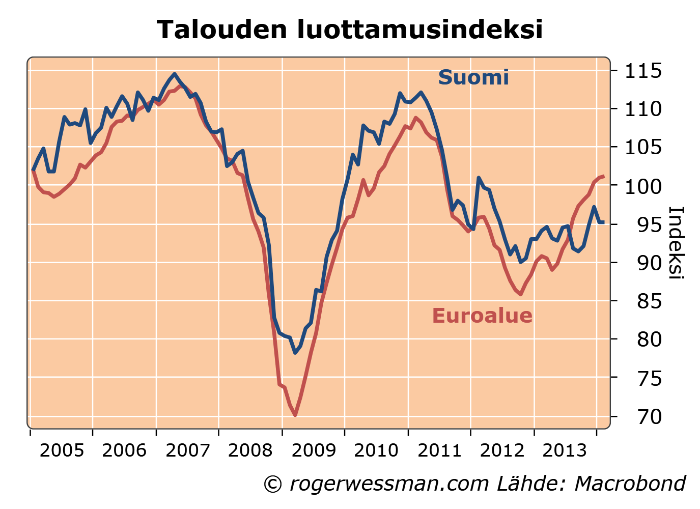Talouselämän luottamusluvuissa Suomen laahaaminen perässä näkyi luottamuksen heikentymisenä kesällä, kun koko euroalueen luottamus vahvistui. Suomenkin luottamus vahvistui kohti vuoden loppua mutta viime kuukausina kuilu on jälleen kasvanut. Tämän perusteella Suomen talouden totuttua kaavaa heikompi kehitys näyttäisi jatkuvan myös ainakin alkuvuonna.