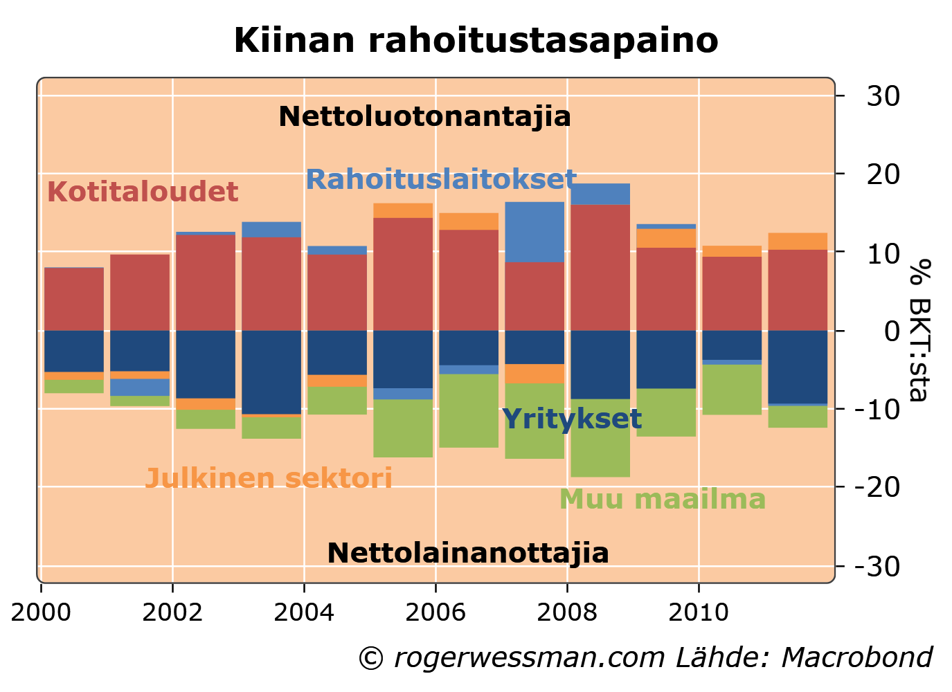 Tällaisen mahdollisen kriisin kehityskulun kannalta keskeinen kysymys on kuitenkin mihin rahat pakenevat. Kiinan luottoboomin rahoittajana on ollut lähinnä kiinalaisten kotitaloudet. Kiinalaisilla kotitalouksilla on hyvin rajoitettuja mahdollisuuksia viedä rahojaan Kiinasta, vaikka halusivatkin. Ulkomaisen rahoituksen ehtyminen ei ole ongelma, koska nettomääräisesti Kiina on jatkuvasti luotottanut muuta maailmaa, ei ottanut luottoa muualta maailmalta. Toki viime vuosien luottoboomi heijastaa osittain sitä, että kasvavassa määrin säästöjä on kanavoitu kotimaahan.