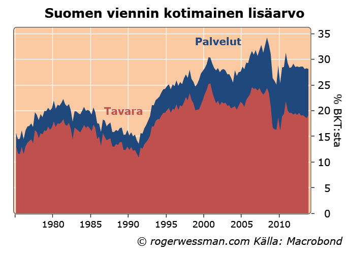 Tämäkin kuva aliarvioi palveluiden merkityksen kasvua. Ensinnäkin tavaraviennissä tuontipanosten osuus on todennäköisesti kasvanut globalisaation myötä. Vielä tärkeämpää on kuitenkin, että yhä suurempi osuus tavaraviennin arvosta koostuu itse asiassa palveluista. Tämä huomioiden Newby arvioi, että yli puolet Suomen viennin kotimaisesta lisäarvosta muodostuu palveluista.