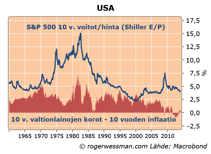 Kuvassa osakekursseja ja korkoja on suhteutettu viimeisen kymmenen vuoden voittoihin ja inflaatioon, tasatakseen tilapäisten inflaation ja voittojen heilahtelujen vaikutus. Ideaalisesti pitäisi tietysti käyttää tulevia voittoja ja tulevaa inflaatiota, mutta niitä emme tietysti tiedä.