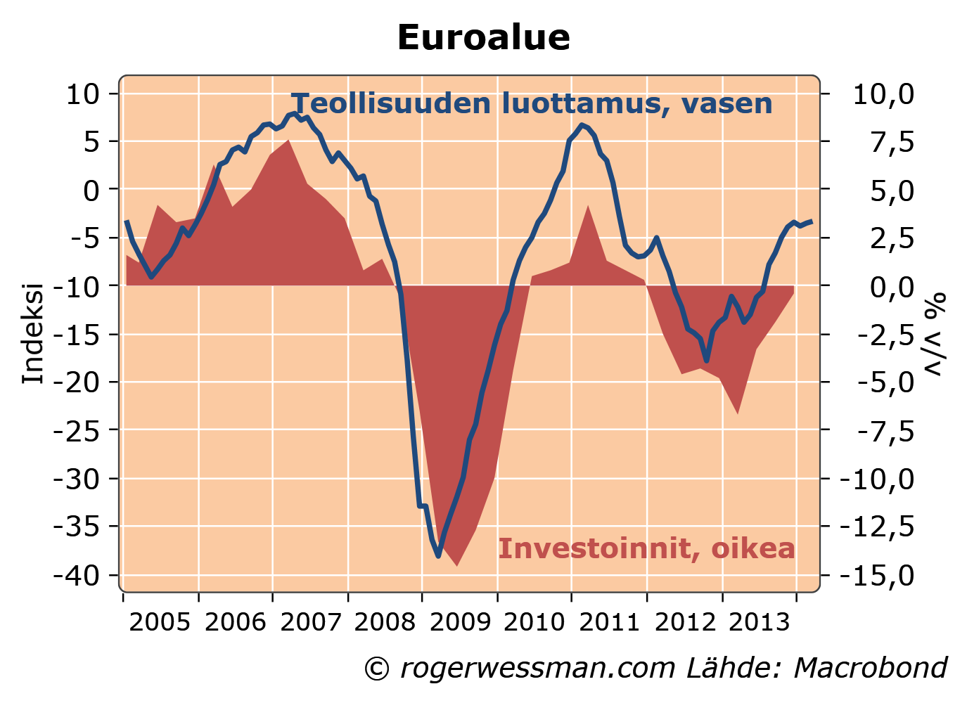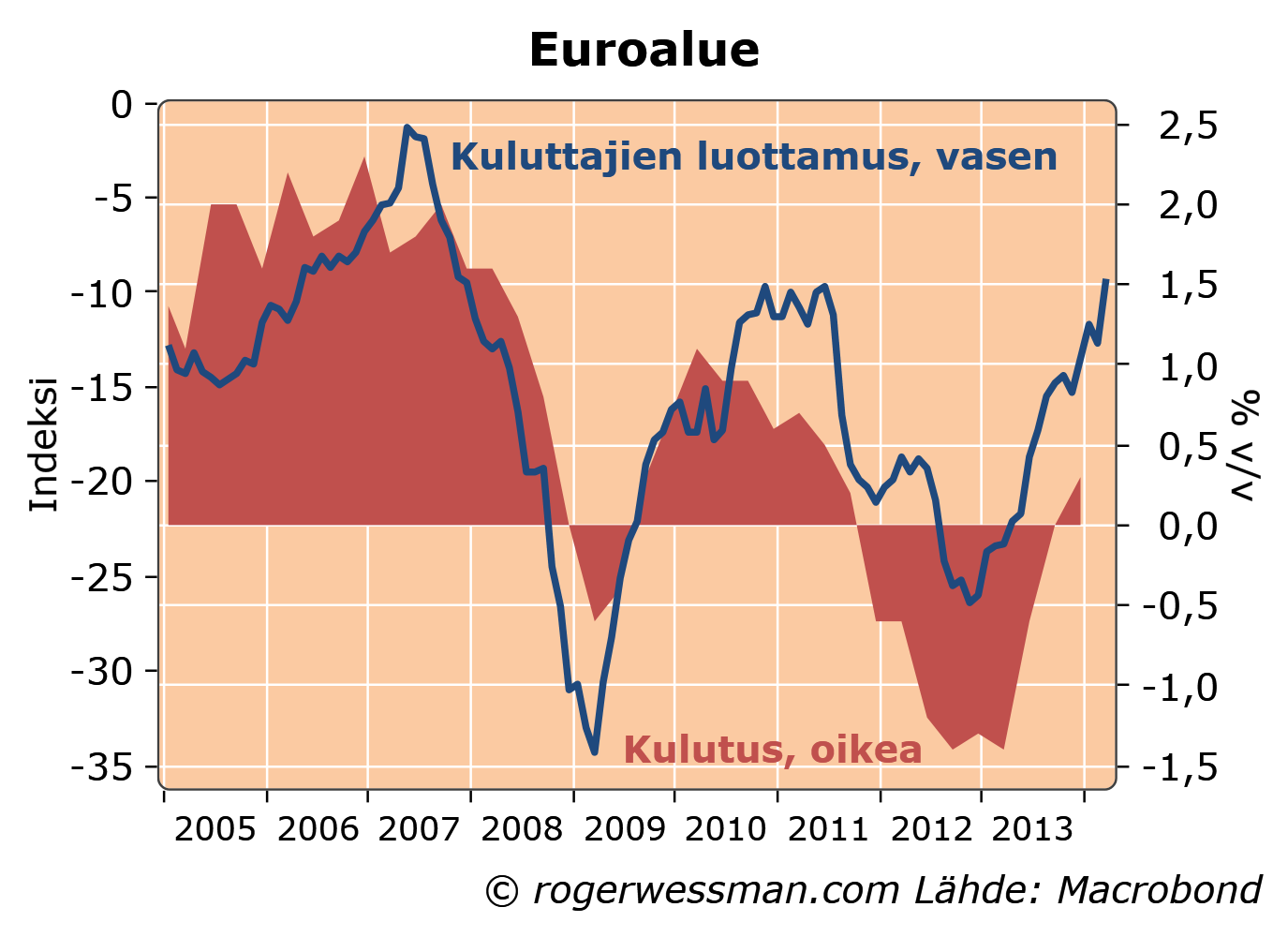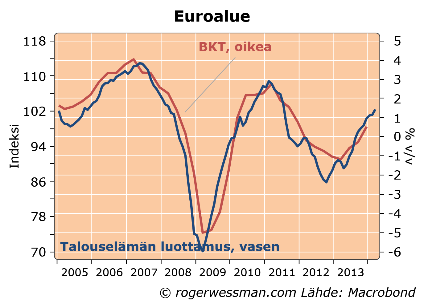 Euroalueen talouselämän luottamus vahvistui korkeimmilleen kolmeen vuoteen ja lupailee jo puolentoista prosentin BKT:n kasvua. Paranemista on ajanut ennen kaikkea kuluttajien luottamus, joka on korkeimmillaan sitten finanssikriisin. Teollisuuden luottamus sen sijaan on viime kuukausina polkenut paikallaan.