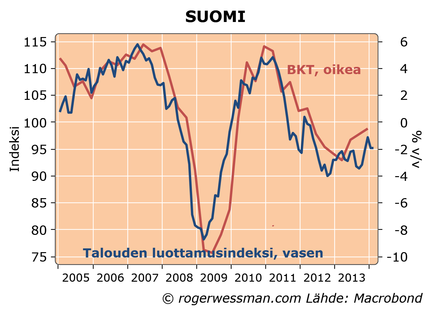 Suomen luottamuslukemat ovat vajonneet takaisin tasolle, joka ennakoi taantuman jatkuvan. Suomessakin kuluttajien luottamus on valopilkku. Yritysten luottamus sen sijaan heikkeni kaikilla sektoreilla. Tämä on sopusoinnussa sen kanssa, että heikkenemistä ajoi huoli Venäjän tilanteesta, joka vaikuttaa niin vähittäiskauppaan kuin teollisuuteenkin.