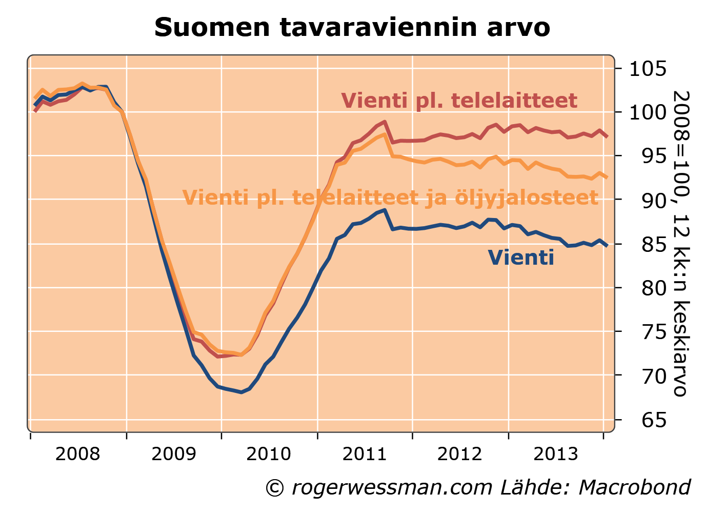 Telelaiteviennin romahduksen suurin vaikutus nähtiin aikaisempina vuosina. Suomen tavaravienti on viimeisen 12 kuukauden aikana ollut 15 prosenttia alempi kuin huppuvuonna 2008. Suurin osa laskusta selitty telelaiteviennin laskulla. Muu vienti on vain kolme prosenttiyksikköä alle vuoden 2008 huipputasojen.