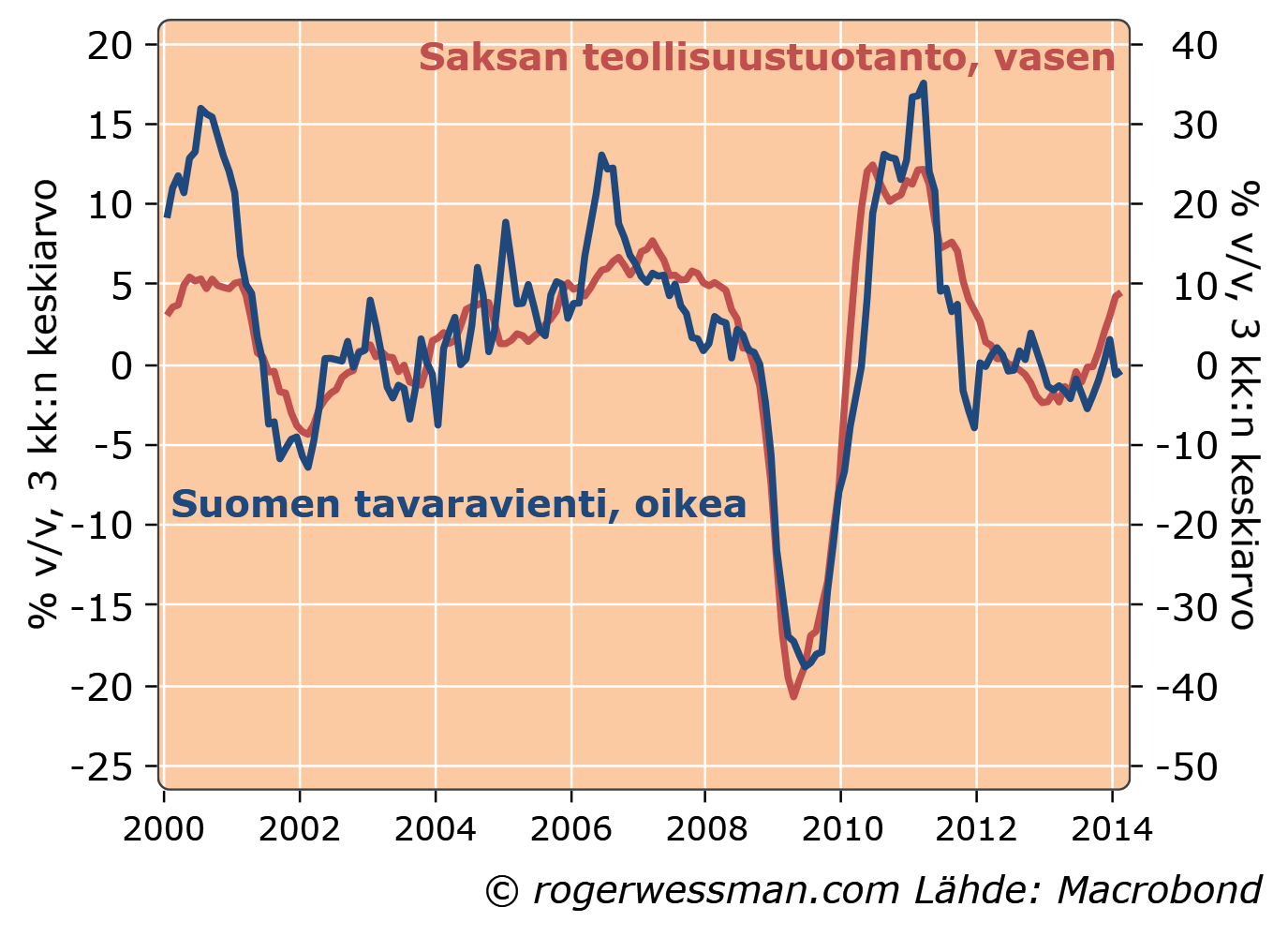 Suomen tavaraviennin ja Saksan teollisuuden kasvun käänteet heijastavat molemmat samoja kansainvälisiä suhdanteita. Useimmiten trendit ovat siten olleet samansuuntaisia. Viime kuukausina Saksan teollisuustuotannon kasvu on piristynyt selkeästi vahvemmin kuin Suomen vienti. Suomen viennin lasku on taittunut, mutta selkeätä käännettä kasvuun ei vielä olla nähty.