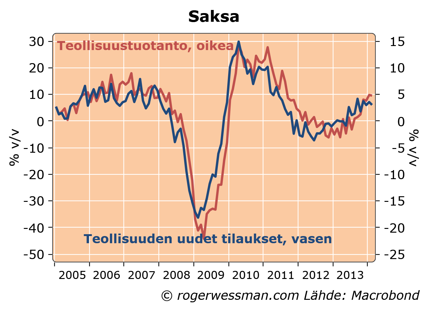 Vaikka Suomi palautuisikin ruotuun (mistä eteenpäin katsovissa lukemissa kuten teollisuuden luottamuksessa ei vielä ole mitään merkkejä) kovinkaan ruusuista kehitystä Suomen viennille Saksan lukemat eivät lupaa. Perjantaina julkaistut Saksan teollisuuden tilausluvut tosin edelleen lupaavat Saksan teollisuudelle kasvua, mutta tilausten kasvu ei enää ole viime kuukausina kiihtynyt. Näköpiirissä on siten parhaimmillaan maltillista kasvua.