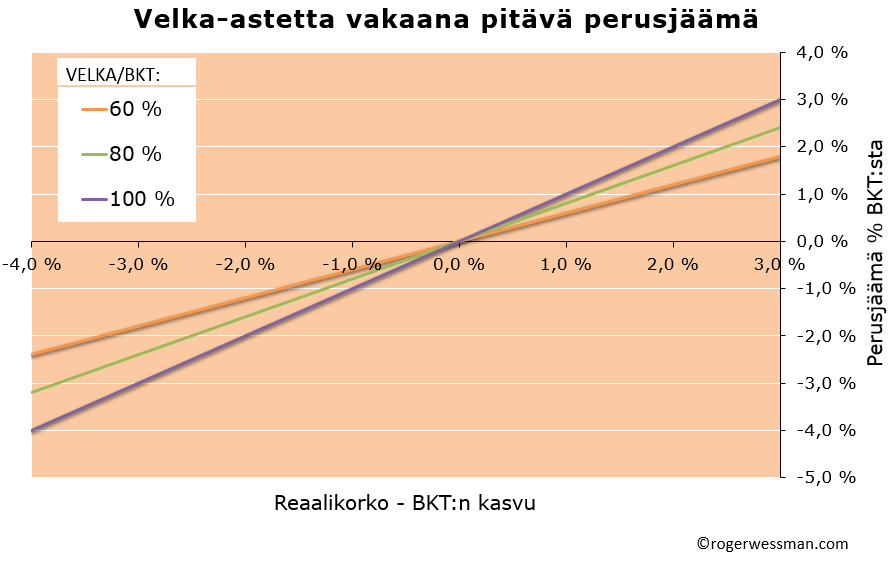 Kuinka paljon julkisia menoja kestävästi voidaan rahoittaa velkaa ottamalla riippuu koron ja talouskasvun erotuksesta. Mitä alhaisempi korko on suhteessa talouskasvuun, sitä suurempaa alijäämää voidaan pitää, ilman että velkaantumisaste nousee. Jos reaalikorko ylittää talouskasvun, perusjäämän pitää olla positiivinen: Rahoja täytyy silloin varata velkojen hoitoon.