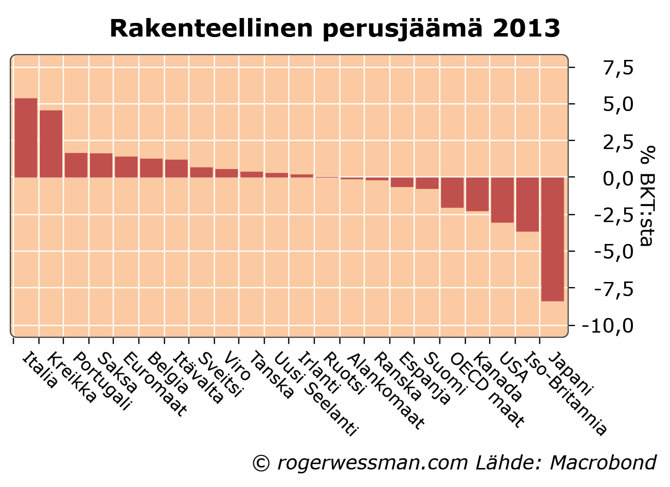 OECD:n arvioiden mukaan useimmilla Euromailla on tällä hetkellä rakenteellinen perusylijäämää. Eli jos puhdistetaan heikkojen suhdanteiden vaikutus, julkinen talous olisi ylijäämäinen ennen velanhoitomenoja. Siinä mielessä Euromaiden julkinen talous on rakenteellisesti jo turhankin hyvässä tasapainossa. Japanilla, Iso-Britannialla ja USA:lla on enemmän haasteita.