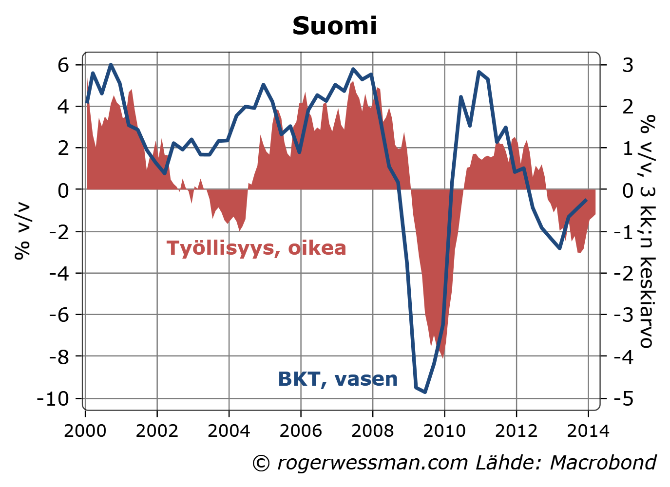 Työllisyys seuraa yleensä talouden käänteitä merkittävällä viiveellä, joten se ei vielä kerro paljokaan siitä onko Suomen talous kääntynyt kasvuun vuoden ensimmäisellä neljänneksellä. Työllisyyden kehitys on itse asiassa ollut yllättävän hyvä verrattuna loppuvuonna edelleen supistuneeseen BKT:hen.