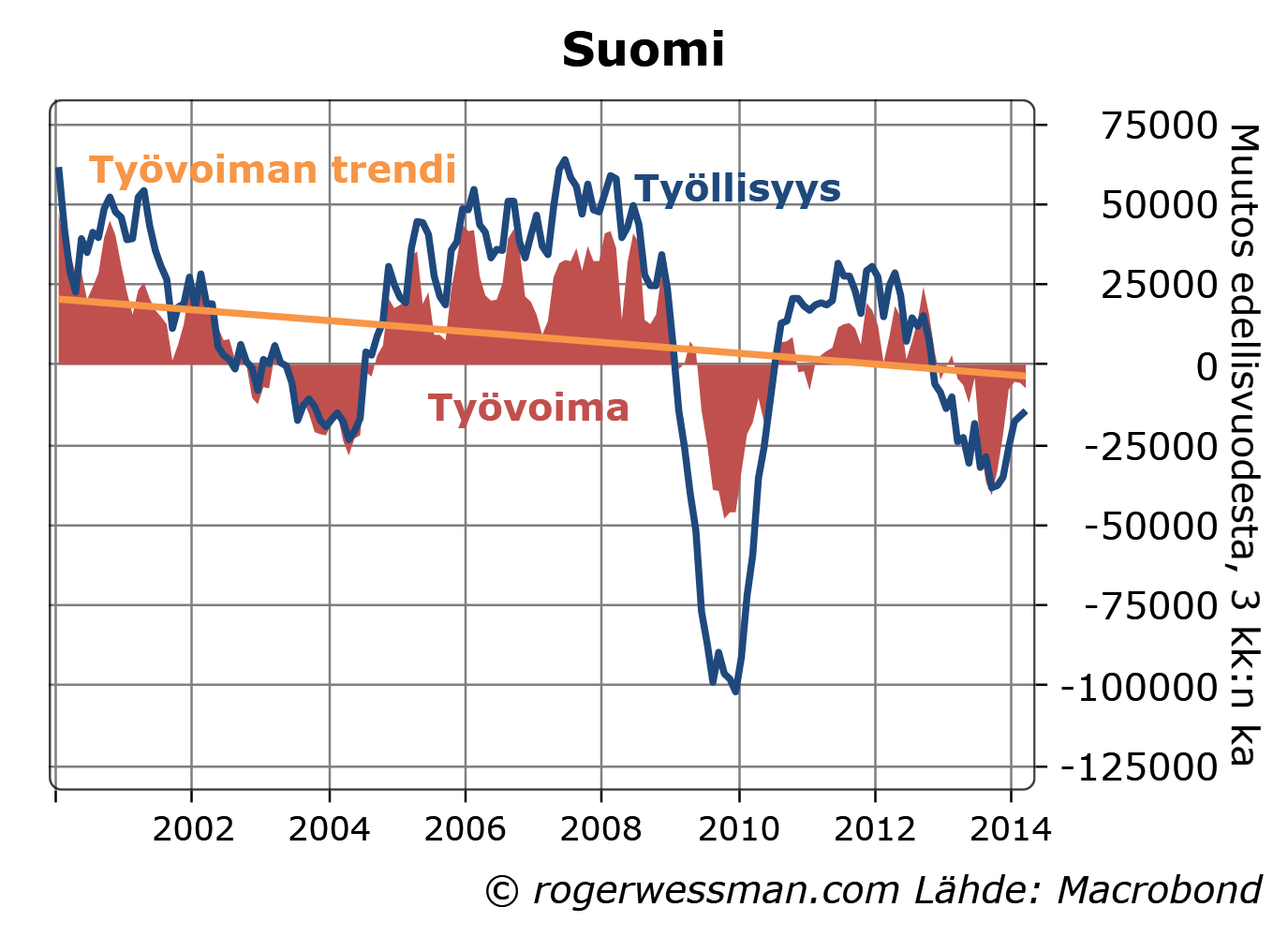 Työvoiman muutokset seuraavat herkästi suhdanteita. Kun työpaikkoja on vähemmän tarjolla useammat jättäytyvät työvoiman ulkopuolelle. Jos ja kun talous piristyy voimme odottaa työvoiman jonkun verran kasvavan kuten vuosina 2011-2012.