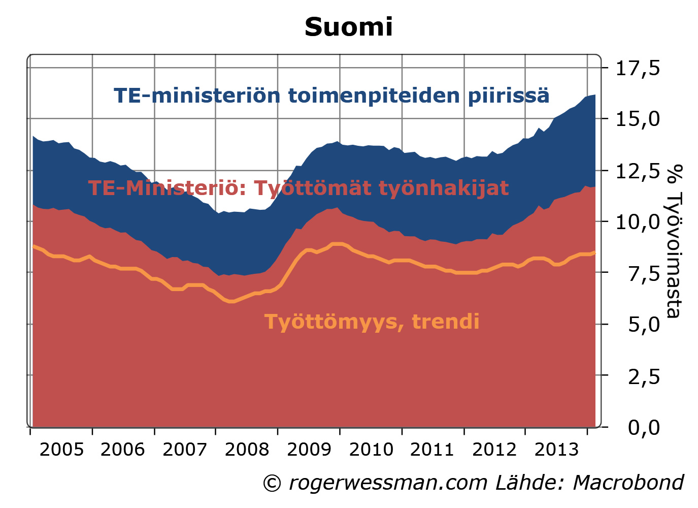 Työttömyyden kasvukorjattu trendi on marraskuusta lähtien pysynyt lähes vakaana 8,4-8,5 prosentissa. Myös työ- ja elinkeinoministeriön korkeammat lukemat (jotka mm. sisältävät aktiivisesta työnhausta luopuneita) ovat vakiintuneet, eikä toimenpiteiden piireissä olevien määrä myöskään ole enää noussut.
