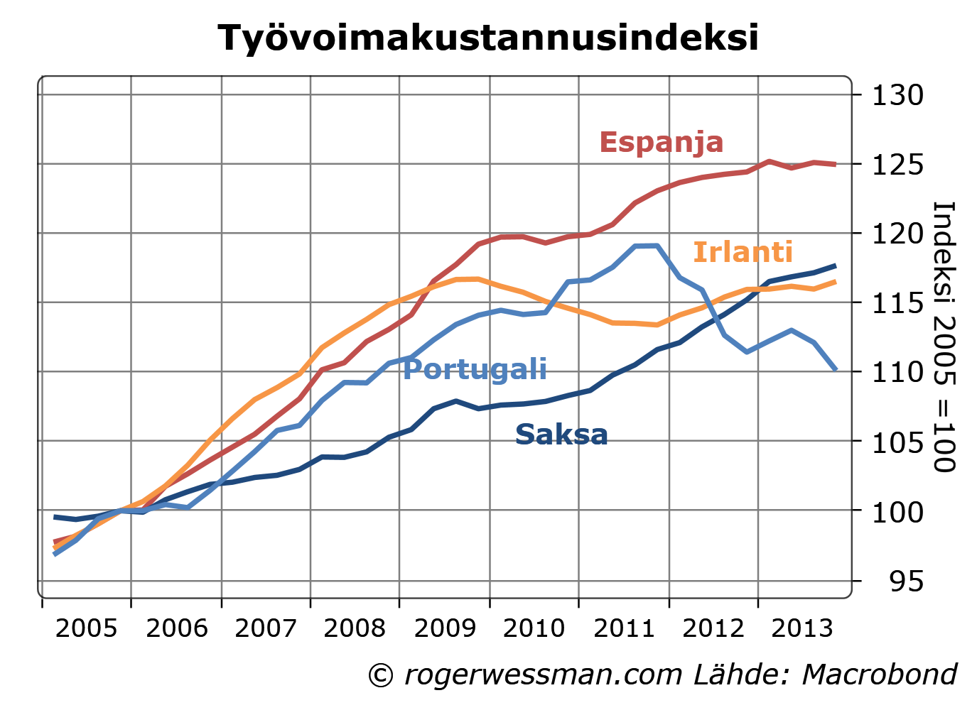 Työvoimakustannusindeksi on monellakin tapaa hieman ongelmallinen mittari, sillä se ei huomioi esimerkiksi työpaikkojen katoamista luotettavalla tavalla. Jos parempipalkkaiset työt yksinkertaisesti katoavat maasta, yksikkötyökustannusten lasku on silloin illuusorista, ja aiheuttaa luonnollisesti julkiselle sektorille alhaisempia verotuloja ja kasvaneita menoja. Toki sisäinen devalvaatio lopulta toimii, mutta olisin hyvin varovainen tulkitsemaan kriisin, tai edes pahimman, olevan ohi. Aiheesta pilvin pimein löytyy netissä, mutta tämä vaikutti ensisilmäilyltä mielenkiintoiselta: http://www.robert-schuman.eu/en/european-issues/0289-labour-costs-and-crisis-management-in-the-euro-zone-a-reinterpretation-of-divergences-in