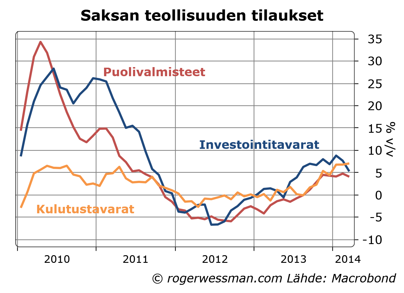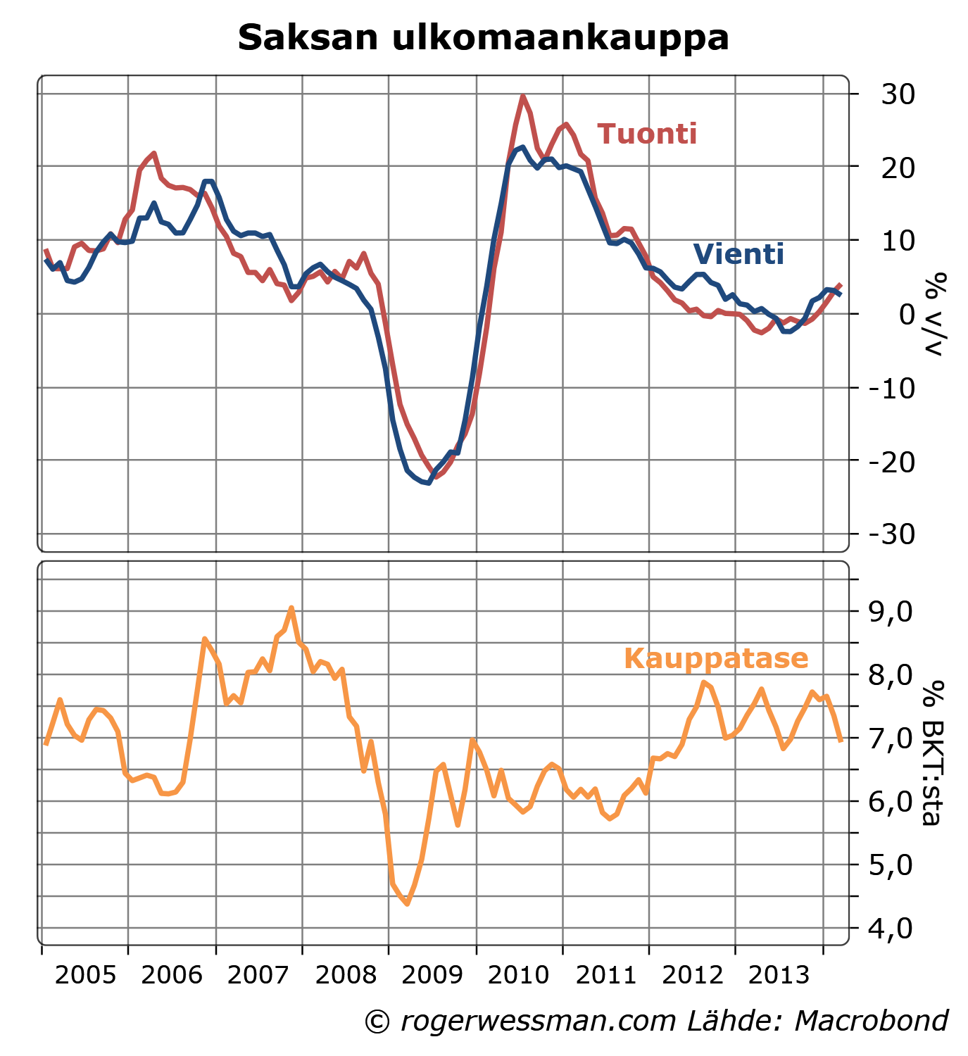 Saksan tuonnin kasvu on viime kuukasina selkeästi piristynet, mikä on antanut vetoapua muulle maailmalle. Kauppatase on edelleen vahvasti ylijäämäinen, mutta ylijäämä ei enää ole kasvanut. Saksa ei siten enää ole toiminut jarruna muun maailmantalouden kasvulle.