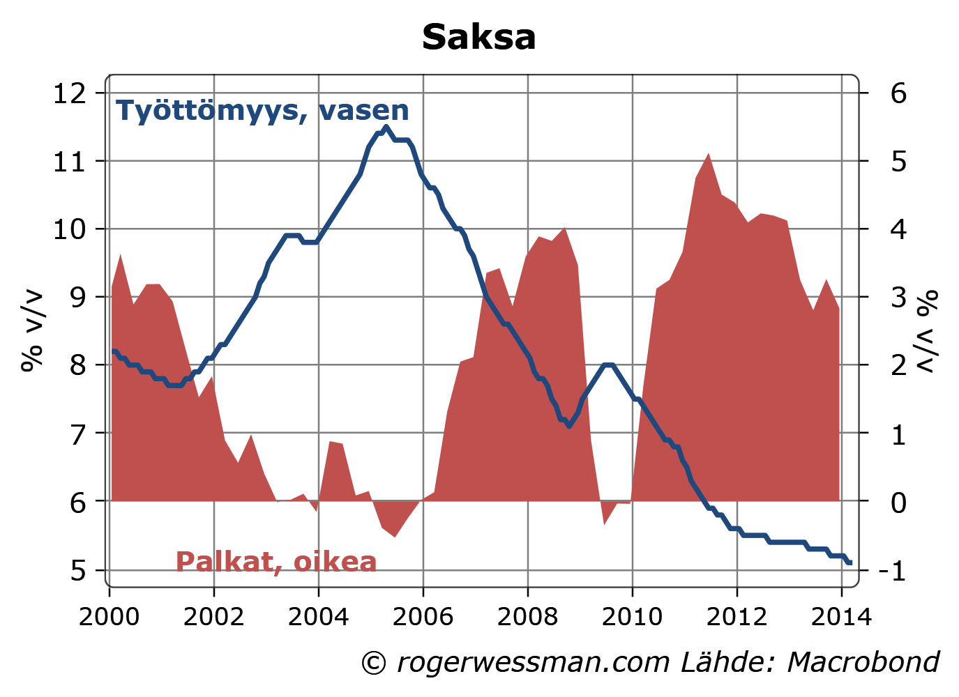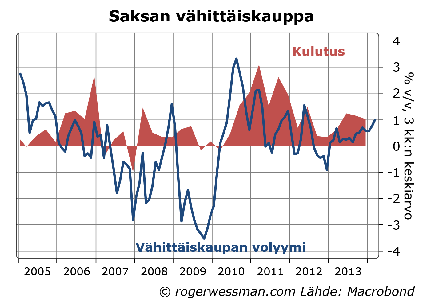 Saksan kulutuskasvu on edelleen ollut varsin vaisu. Työttömyyden jatkuva lasku ja sen mukanaan tuomat palkkojen nousupaineet ovat kuitenkin omiaan tukemaan kulutuksen piristymistä.