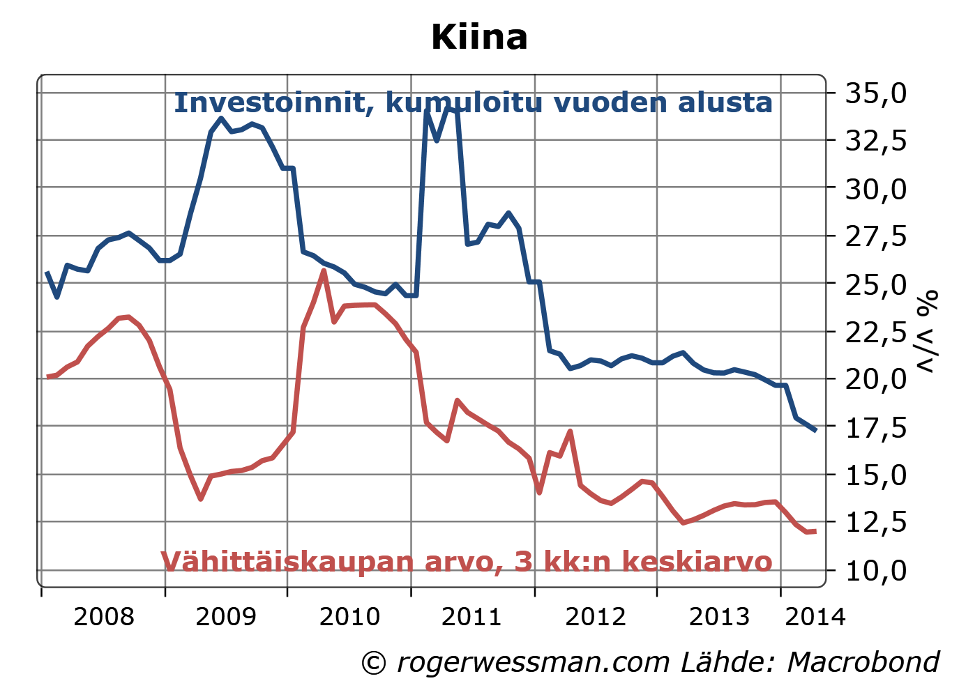 Kotimaisen kysynnän kohdalla vähittäiskaupan kasvu on viime kuukausina pysynyt suhteellisen vakaana. Investointien kasvu sen sijaan on edelleen hidastunut. Selkeästi asuntomarkkinoiden viileneminen hidastaa investointeja. Jatkuvasti tulee kuitenkin signaaleja viranomaisten valmiudesta vaimentaa rakennussektorin viilenemistä, esimerkiksi ohjeistamalla pankkeja höllentämään rahahanoja.