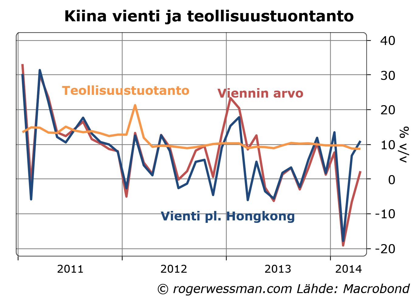 Teollisuustuotannon kasvu hidastui edelleen huhtikuussa hivenen. Se on kuitenkin pysynyt epäilyttävän vakaana kymmenen prosentin tuntumassa. Kuvaa suhteellisen vakaasta kehityksestä tukevat kuitenkin enemmän normaalia heiluntaa heijastavat vientilukemat. Vienninkin vuosikasvu on palautunut helmikuun notkahduksen jälkeen kymmenen prosentin paikkeille, kun puhdistetaan Hongkongin vientiin liittyvä tilastovääristymä.