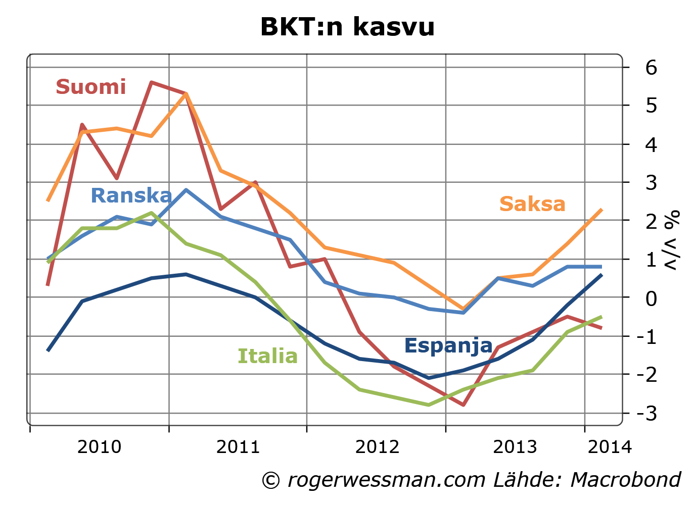 Suomen BKT:n kehitys on viimeisen vuoden aikana ollut Italiaakin heikompi.