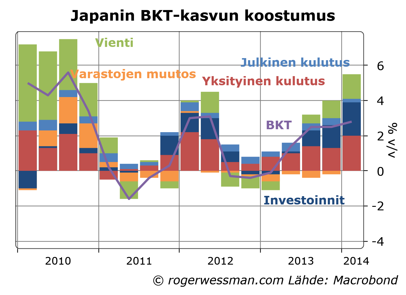 BKT:n kasvu on tosin jäänyt vajaaseen kolmeen prosenttiin. Erotus selittyy tuonnin kasvulla, eli Japanin elvytys on vahvasti tukenut myös muun maailmantalouden kasvua. Kolmen prosentin kasvu on kuitenkin selkeästi ripeämpää, kun mitä Japanin talous pystyy ylläpitämään kun työvoima supistuu väestön ikääntyessä.