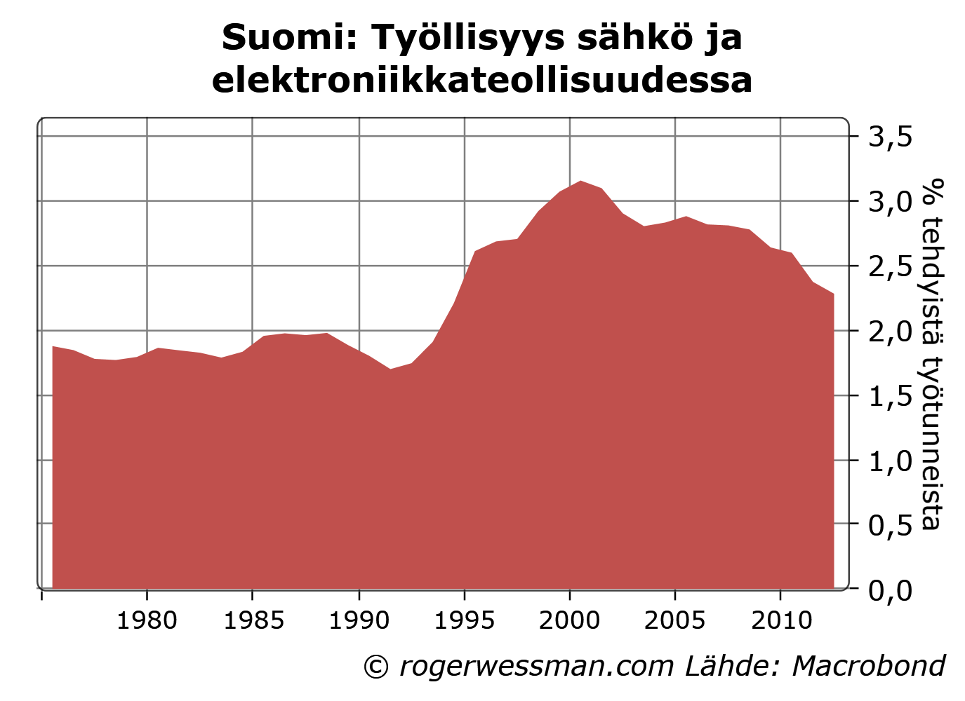 Kirjoitin eilen siitä kuinka merkittävä osuus sähkö- ja elektroniikkateollisuuden laskulla on Suomen talouden heikkoon kehitykseen. Työllisyyden kehityksessä sen sijaan vaikutus on ollut paljon pienempi. Teollisuuden osuus tehdyistä työtunnista on aina ollut selkeästi pienempi kuin sen osuus tuotannosta. Tämän toimialan osuus tehdyistä työtunneista on tippunut vain reilusta kolmesta reippaaseen kahteen prosenttiin.