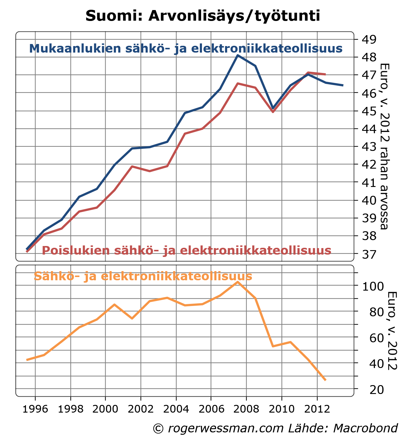 Sain lukijalta kysymyksen siitä, olenko tehnyt arvion Nokian vaikutuksesta Suomen synkkään tuottavuuskehitykseen. Karkea laskelma kertoo, että tuottavuus Suomessa on jatkanut kasvuaan viime vuosina, jos puhdistetaan elektroniikkateollisuuden vaikutus luvuista. Tämä puolestaan on suoraan vaikuttanut yksikkötyökustannusten kehitykseen. Kaikki laskelmat Suomen kilpailukyvyn yleisestä heikkenemisestä viime vuosina jotka perustuvat yksikkötyökustannuksiin ovat siten vastaavasti epäluotettavia.
