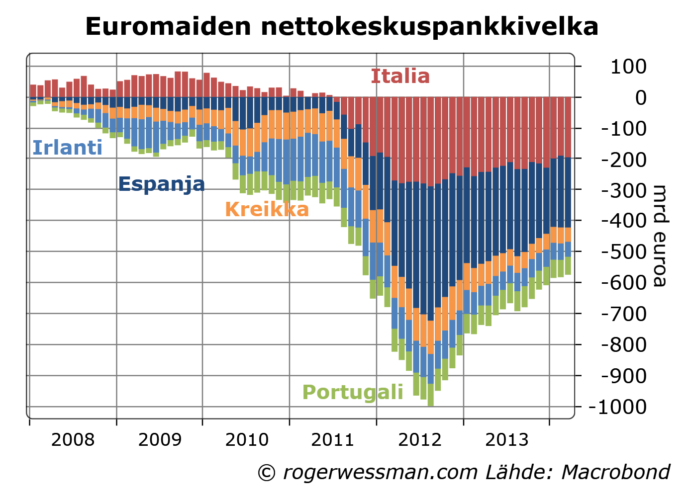 Jos kaaviossa ”BKT Usa vasen, Euroalue oikea”, olisi kolmantena käyrä: ”Suomi, oikea”, niin veikkaisin suomen käyrän olevan selvästi alimmaisena v. 2014 ?