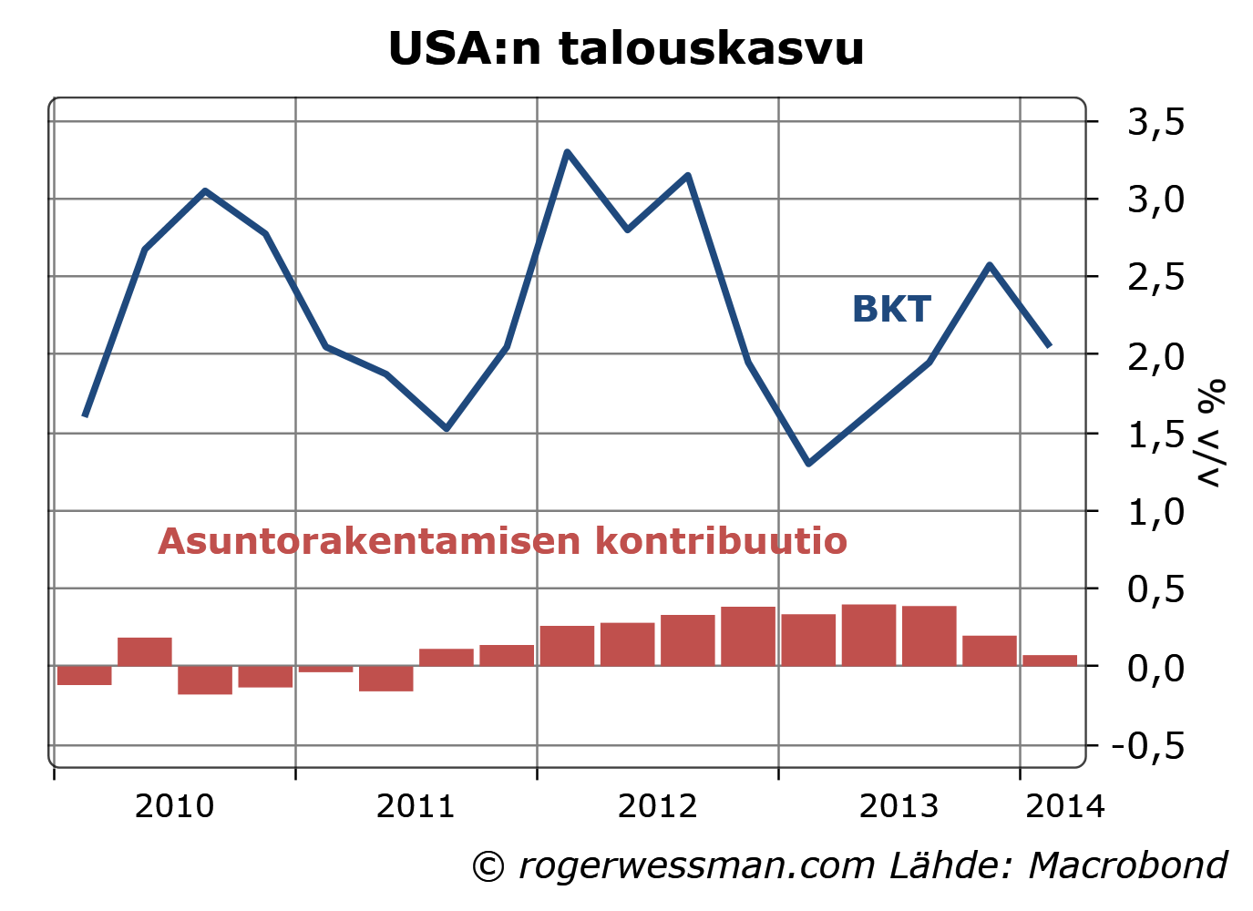 USA:n asuntomarkkinat kääntyivät vuonna 2012 selkeästi talouskasvua tukevaksi tekijäksi. Parhaimmillaan viime vuoden alkupuolella asuntorakentamisen suora vaikutus talouden kasvuun oli lähes puoli prosenttiyksikköä. Epäsuora vaikutus (huomioiden vaikutus tulojen kasvuun ja siten kokonaiskulutukseen) oli todennäköisesti selkeästi suurempi.