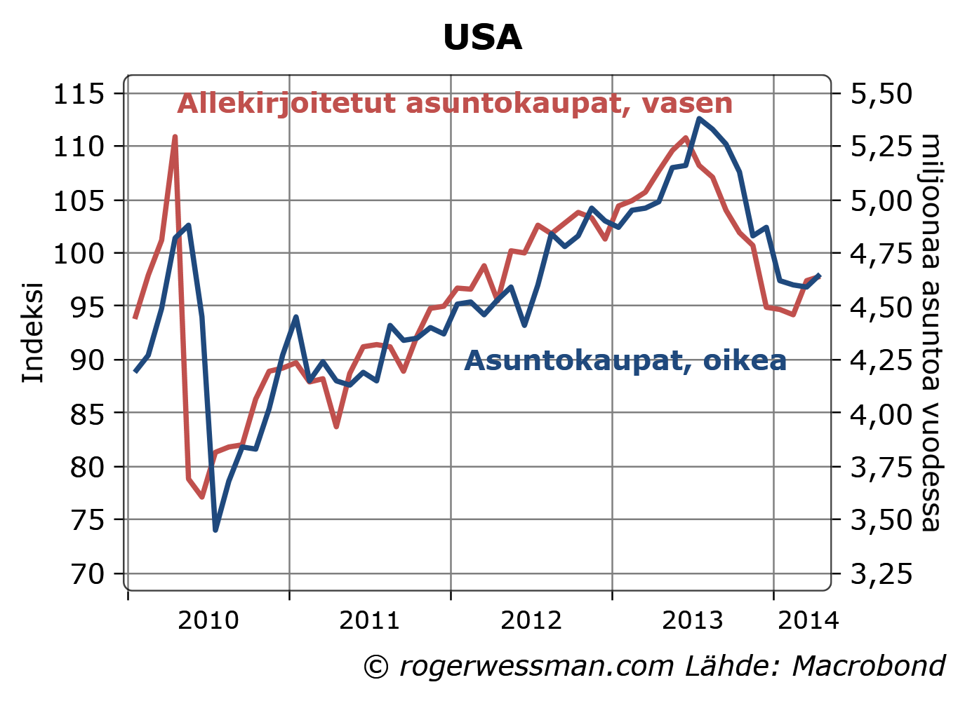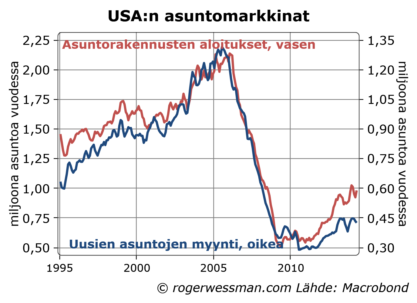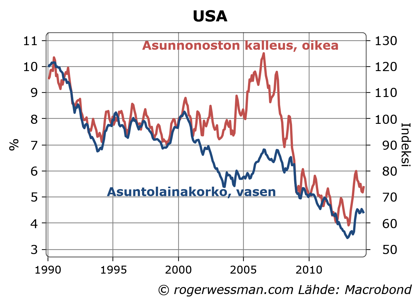 Viimeisen vuoden aikana USA:n asuntomarkkinat ovat selkeästi viilentyneet johtuen asuntolainojen korkojen noususta viime vuonna. Tämä kehitys vahvistaa, että keskuspankin kannattaa olla varovainen rahahanojen kiristämisessä ja siten kuvaa siitä että korot tulevat pysymään pitkään alhaisina.