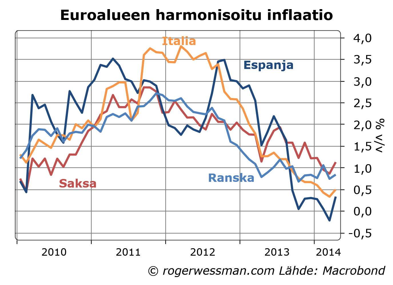 Se että inflaatio kriisimaissa on hidastunut eniten ei anna erityistä syytä huoleen. Se on itse asiassa hivenen lohduttava asia. Se kielii siitä, että eurotalouksien suhteellinen kilpailukyky on korjaantumassa. Erot suurten euromaiden inflaatiossa ovat pienet, joten kovin ripeästi kilpailukyvyn tasapainottuminen ei etene. Tällä hetkellä myös Saksassa inflaatio on selkeästi alle EKP:n tavoitteen.