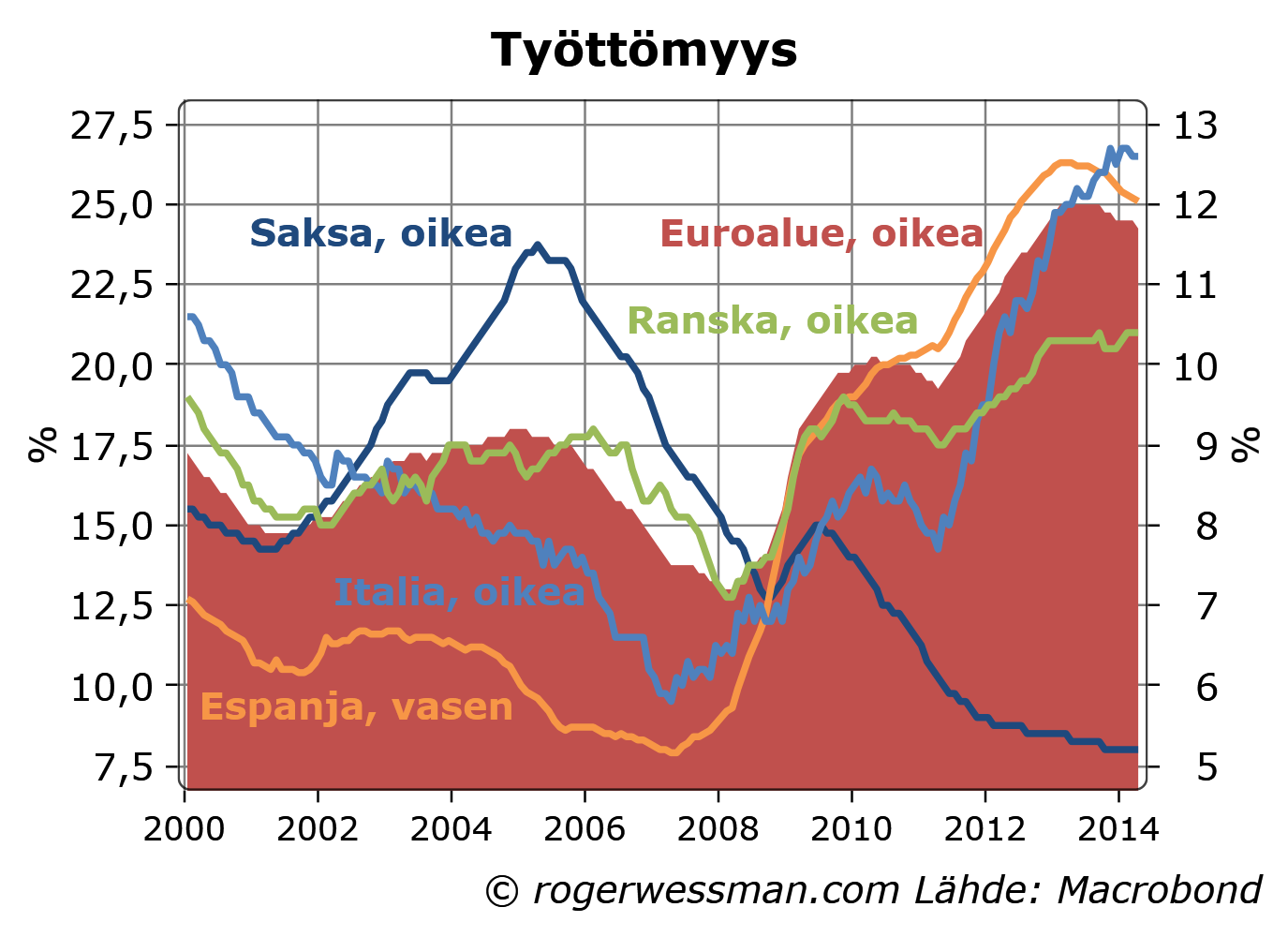 Suurista euromaista työttömyyden lasku on ollut selkeintä Espanjassa, jossa työttömyys on korkein ja siten on vähiten syytä pelätä, että työttömyyden laskua aiheuttaa palkkapaineita. Italiassa ja Ranskassa työttömyyden nousu on hädin tuskin taittunut.