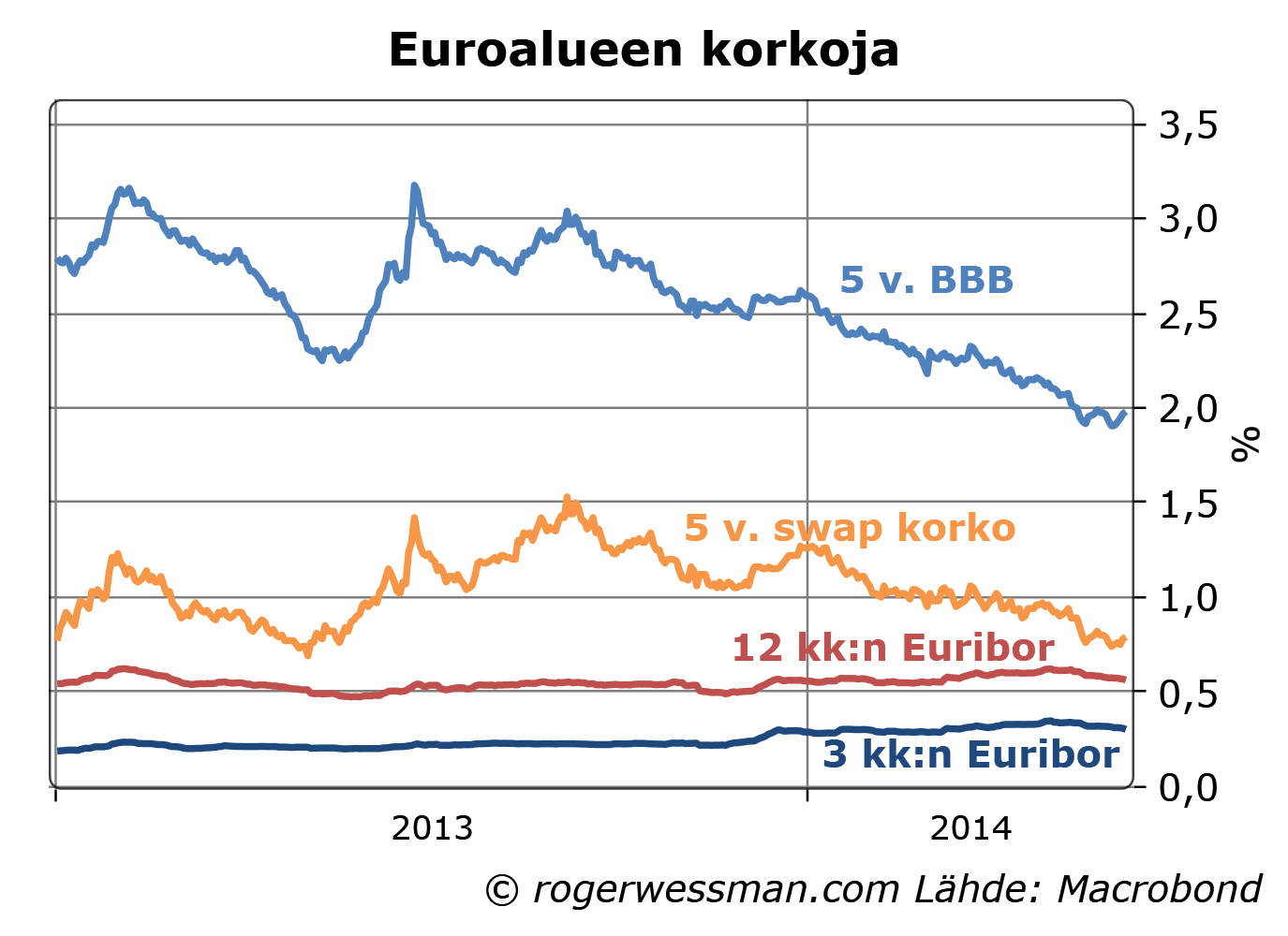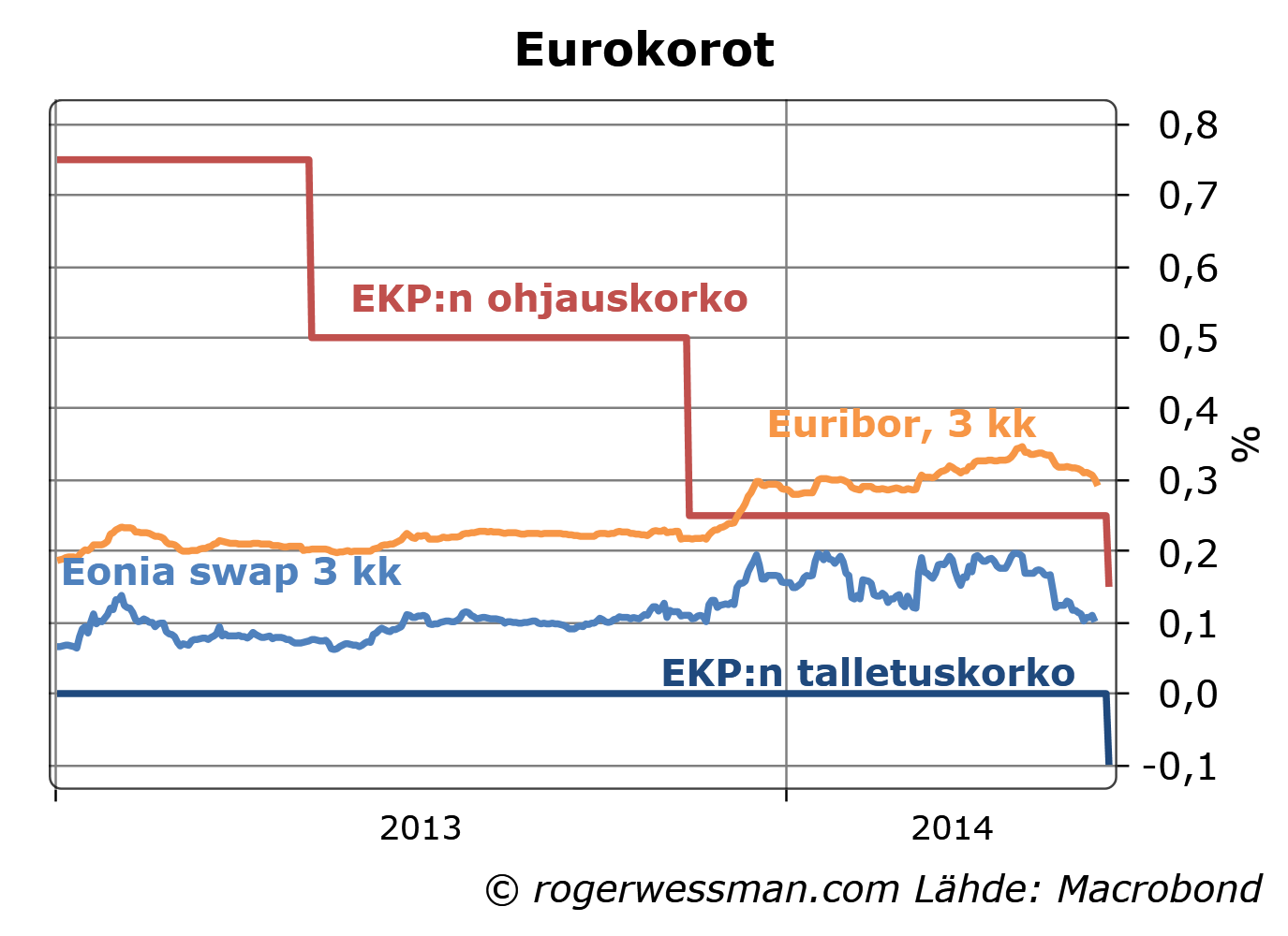 EKP vaikuttaa olevan samaa mieltä. Draghi totesikin selkeästi, että koroissa nyt pohja on saavutettu. Talletuskoron lasku -0,1 prosenttiin ei tämän mukaan ollut kokeileva askel, joka ennakoi yritys painaa markkinakorkoja alle nollan.