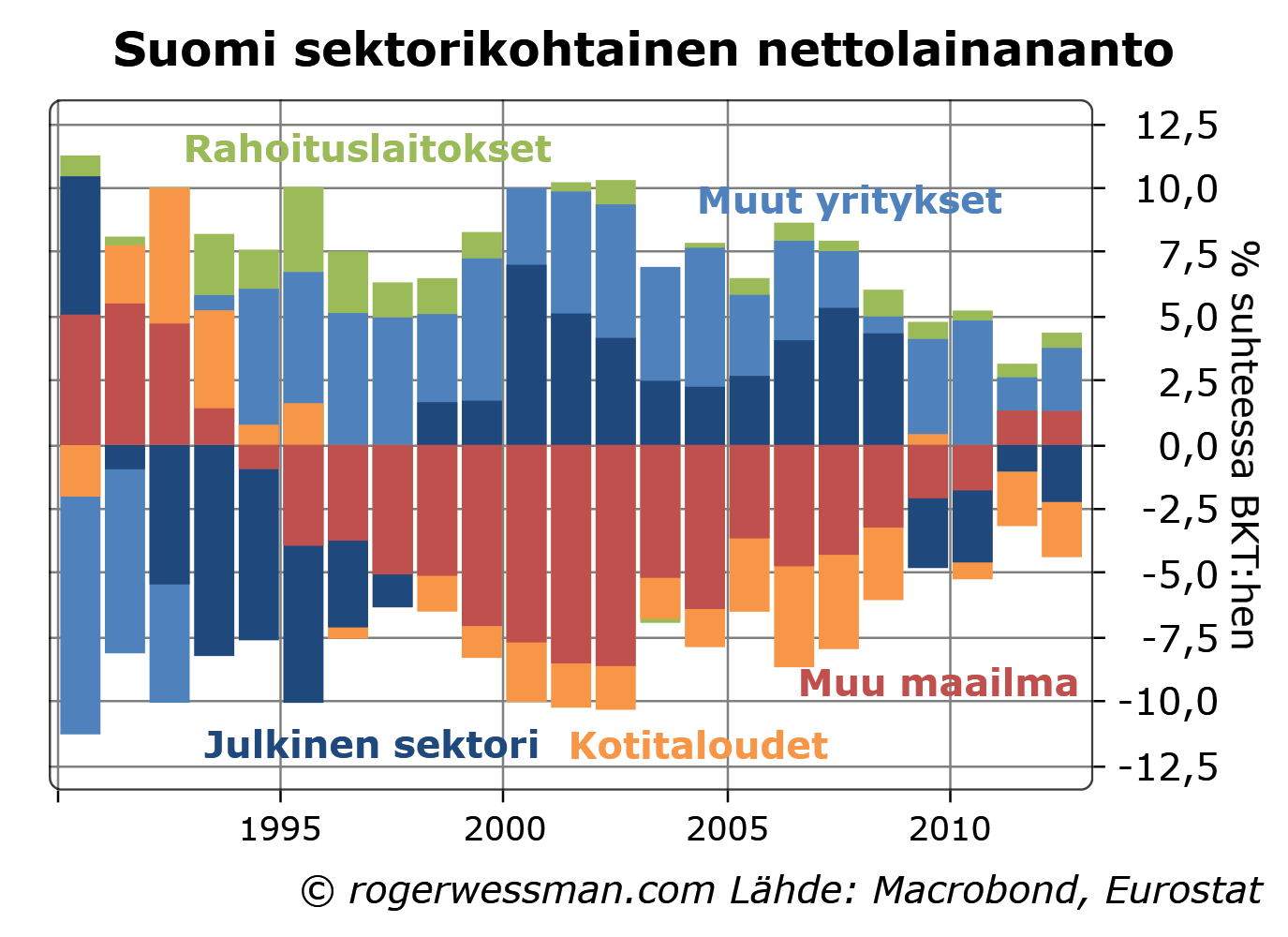 Tilastot vahvistavat, että nettomääräisesti lainaa antavat ja lainaa ottavat sektorit ovat tasapainossa, kuten niiden tietysti loogisesti täytyykin olla. Laina ei tule tyhjästä, sen enempää kuin sähköä tulee tyhjästä pistokkeeseen. Kuvassa siis positiivinen lukema tarkoittaa että sektori on nettomääräisesti lainanantaja, negatiivinen että sektori on nettolainanottaja.