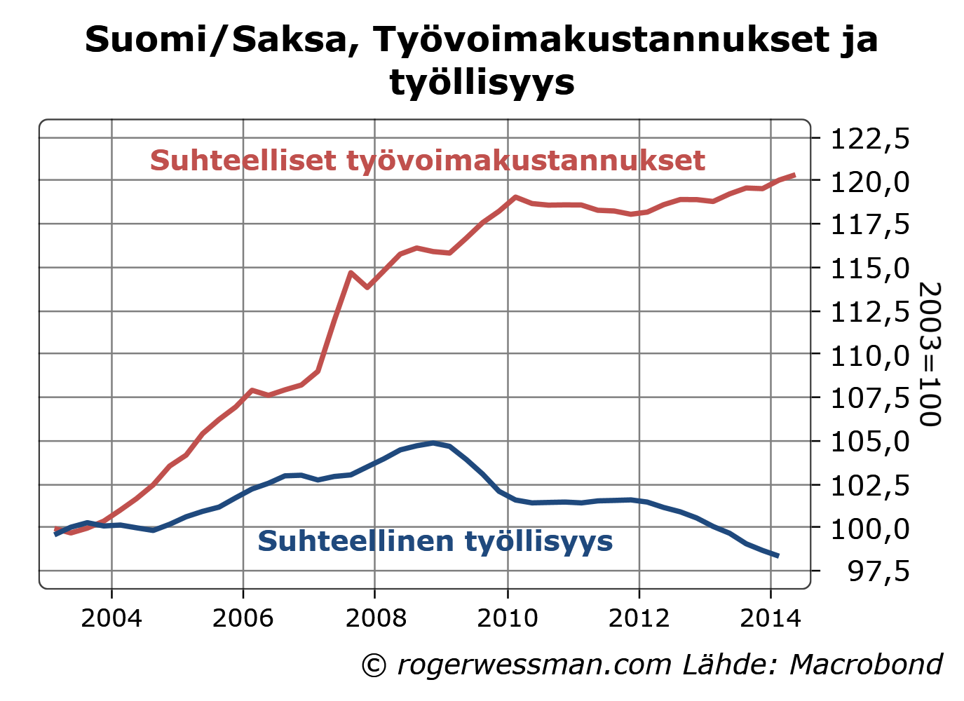 Viiden prosentin laskulla työvoimakustannuksista vastaa myös ainoastaan neljäsosan suomalaisten työvoimakustannusten noususta suhteessa Saksaan viimeisen kymmenen vuoden aikana. Jos työllisyyden herkkyys palkkojen laskuun olisi todellakin niin suuri, että viiden prosentin palkkojen laskulla Suomeen palautettaisiin täystyöllisyys, työvoimakustannusten suhteellisten muutosten olisi pitänyt näkyä paljon selkeämmin työllisyyskehityksessä.