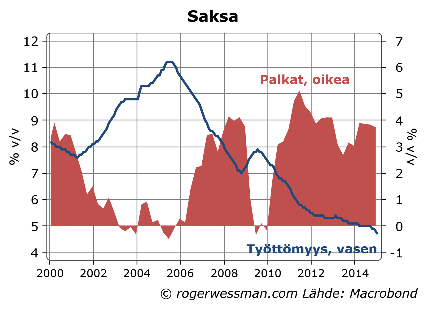 Kirjoitin perjantaina päivityksen siitä, että Saksan talous on ajautumassa uusille urille: ”Kasvavan työvoimapulan myötä teollisuuden voittokulku on takana, ja nyt on kotimarkkinoiden juhlan aika”. Vaikka pidän palkkojen nousua nyt hyvänä asiana, se ei tarkoita että edellisen vuosikymmenen työmarkkinauudistukset, jotka mm jarruttivat palkkojen nousua, olisivat olleet huono asia. Palkkojen nousu nyt, ja teollisuuden nousun hyytyminen, ei tarkoita että uudistuksien tuomaa hyötyä nyt murrennetaan.